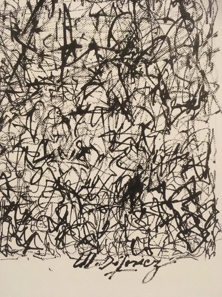 En partant de la même composition, ce deuxième tableau est d’un graphisme diffèrent. J’ai utilisé un bambou avec de l’encre de chine pour la diversité du trait.